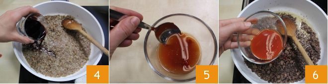 Depois adicione o vinho e deixe evaporar 4. Diluia o extrato de tomate em pouca água 5 e adicione à carne 6, misture bem, ajuste o sal e a pimenta e continue cozinhando por 20 minutos em fogo moderado.