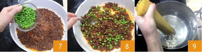 Quando a carne estiver quase cozida e o molho tiver engrossado, adicione as ervilhas congeladas 7 e termine o cozimento mexendo com frequência para não grudar os ingredientes no fundo da panela 8. Uma vez pronto, deixe esfriar o ragù de carne e ervilhas e coloque-o em uma tigela coberta com filme plástico, depois coloque-o na geladeira. Leve bastante água salgada para ferver e cozinhe o espaguete 9.