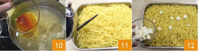 Enquanto isso, dissolva o açafrão em pó com um pouco da água do cozimento e adicione à massa 10. Quando o espaguete estiver cozido (recomendamos não escorrer al dente), escorra e coloque em uma assadeira com um pouco de óleo, para não grudar 11. Deixe esfriar completamente, depois tempere com manteiga 12;