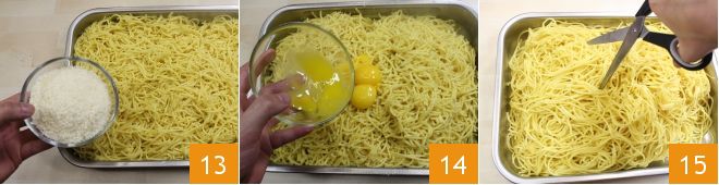 E queijo parmesão ralado 13, ajuste o sal e adicione as gemas 14. Misture bem todos os ingredientes e corte grosseiramente a massa, ajudando-se com uma tesoura de cozinha 15.