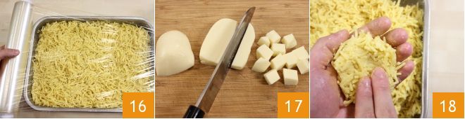 Cubra agora a assadeira com o filme plástico e coloque na geladeira por uma noite 16. Decorrido o tempo indicado, retire a massa e o ragù da geladeira, depois corte a scamorza em cubinhos 17. Comece a compor os arancini pegando um pouco de espaguete e formando uma bola, com dois dedos crie um buraco no centro 18;
