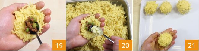 E adicione uma colherinha de ragù 19 e alguns pedacinhos de queijo 20. Sempre ajudando-se com a pressão das mãos, feche o arancino e coloque-o em uma bandeja. Proceda da mesma forma até formar todos os arancini.