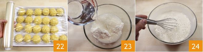 Cubra tudo com filme plástico e coloque na geladeira por cerca de dez minutos. Enquanto isso, prepare a massa colocando em uma tigela farinha, água e uma pitada de sal 23. Com um batedor, misture todos os ingredientes, até formar uma mistura líquida e sem grumos 24.