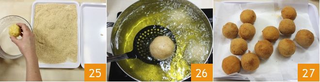 Aqueça o óleo para fritar e comece a passar, um a um, os arancini primeiro na massa e depois na farinha de rosca 25. Quando o óleo estiver bem quente, comece a fritá-los por no máximo 5-6 minutos 26, ou até que a crosta esteja dourada (para verificar se o óleo está na temperatura certa, faça o teste do palito: mergulhe a ponta de um palito de madeira no óleo, se começar a fritar então estará quente o suficiente). Deixe escorrer os arancini em uma bandeja revestida com papel absorvente para que percam todo o excesso de óleo 27. Assim seus arancini de espaguete estarão prontos para serem saboreados!