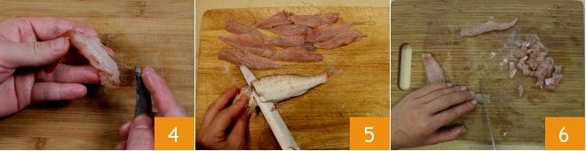 Retire com uma pinça o intestino dos camarões 4, o filete negro central. Depois, limpe também os lagostins, destacando a cabeça e cortando com a tesoura a carapaça para retirar a polpa; retire também o intestino e pique tanto os camarões quanto os lagostins. Por último, pegue os salmonetes já limpos (alternativamente, abra-os para retirar as vísceras), faça um corte nos salmonetes na parte superior inserindo a lâmina da faca perto da cabeça e filete-os 5, cuidando de retirar as espinhas dos filés com uma pinça. Em seguida, pique os filés obtidos 6.