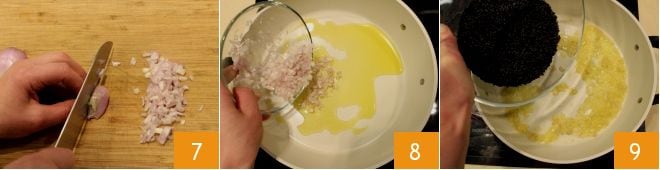 Reserve as preparações do peixe e dedique-se ao cozimento do arroz venere: pique a cebola échalote 7 e coloque-a em uma panela ampla com um fio de azeite 8. Refogue em fogo baixo evitando queimar a cebola, depois adicione o arroz venere 9.