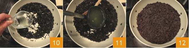 Toque o arroz, depois de 5 minutos adicione o vinho branco 10 e aos poucos o caldo de peixe 11 para favorecer o cozimento do arroz venere (o cozimento dessa qualidade de arroz é muito longo, você pode reduzir o tempo usando uma panela de pressão ou comprando arroz venere pré-cozido). Perto do final do cozimento, adicione um pouco de amido de arroz que tornará os arancini mais compactos quando for formá-los. Termine o cozimento e apague o fogo 12.