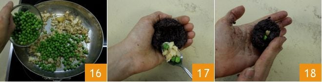 Adicione as ervilhas 16 e cozinhe por alguns minutos (se usar ervilhas congeladas, pode fervê-las por alguns minutos em água fervente); depois retire o alho e desligue o fogo. Deixe esfriar as preparações e, uma vez frias, você pode formar os arancini: umedeça as mãos com um pouco de óleo, depois achate um pouco de arroz na palma da mão e faça uma cavidade no centro. Coloque o recheio dentro do arroz 17 e feche 18 formando uma bolinha. Para dar a forma clássica do arancino, forme a bolinha e depois aperte uma parte para formar um ápice.