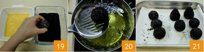 Em uma tigela, bata os ovos e prepare as sementes de gergelim preto; depois passe os arancini primeiro no ovo batido e depois no gergelim preto 19, cobrindo cuidadosamente toda a superfície. Frite um ou dois arancini de cada vez em bastante óleo vegetal (não deve ultrapassar a temperatura de 170°C) 20, depois coloque-os em uma bandeja coberta com papel absorvente 21. Sirva seus arancini quentes ou mornos!