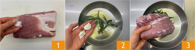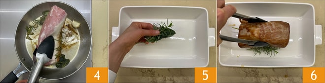Doure todos os lados até que fiquem dourados 4. Em uma assadeira coloque sálvia, alecrim 5, e o lombo 6.