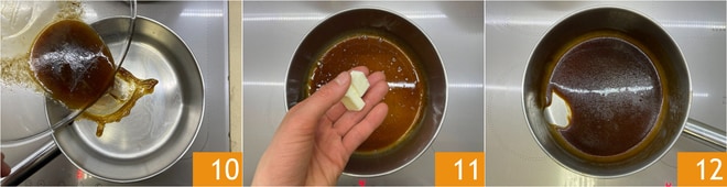 Deglace a assadeira com um pouco de água para recuperar o fundo de cozimento e transfira para uma panela pequena 10. Se necessário, reduza um pouco e depois adicione a manteiga 11, deixe derreter para obter um molho fluido 12; reserve.