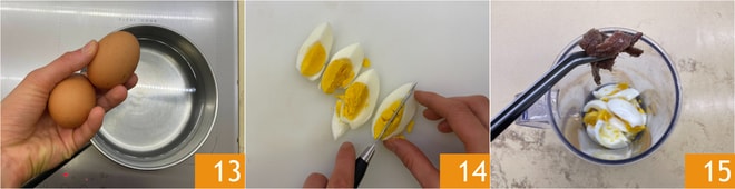 Cozinhe os ovos 13 e, uma vez prontos, corte em gomos 14. Em um copo alto, transfira os ovos, adicione os filés de anchova 15.