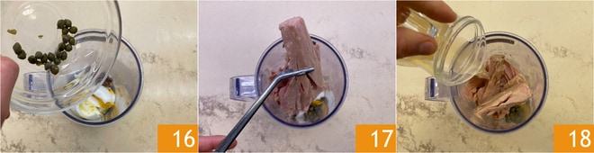 Adicione as alcaparras 16, o atum 17 e o caldo de carne 18.