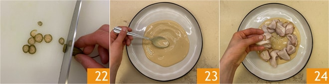 Corte os frutos de alcaparra em rodelas 22. Monte o prato colocando no fundo o molho tártaro 23, disponha o lombo fatiado por cima, sobrepondo ligeiramente as fatias 24.