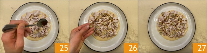 Adicione mais molho tártaro, o molho do fundo de cozimento 25 e os frutos de alcaparra 26. O seu lombo de porco com molho tártaro está pronto para ser saboreado 27.
