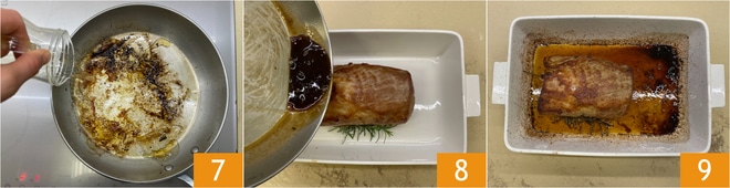 Deglace a frigideira com o vinho branco 7, desta forma você recuperará o fundo de cozimento, e depois regue 8. Cozinhe no forno estático, pré-aquecido, a 180°C por cerca de 1 hora, molhando de vez em quando o lombo com o fundo de cozimento. A carne estará pronta 9 quando a temperatura interna atingir 70°C. Para medir, use um termômetro sonda durante todo o cozimento. Deixe esfriar completamente.