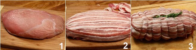 Para começar, prepare o seu pedaço de carne: coloque-o sobre uma tábua de cortar 1 e disponha as fatias de bacon sobre o assado no sentido do comprimento, até cobrir toda a superfície 2. Em seguida, prossiga amarrando o assado, Como amarrar o assado para ver como fazer e adicione o ramo de alecrim 3.