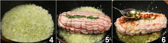Em uma panela grande o suficiente, refogue a cebola picada finamente junto com o óleo 4 e a manteiga, quando a cebola estiver transparente, adicione o assado envolto no bacon 5, doure-o virando de todos os lados por cinco minutos. Quando estiver selado, adicione o vinagre 6.