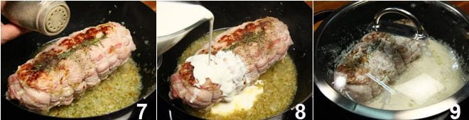 e tempere com pimenta e sal a gosto 7, aromatize também com noz-moscada. Em seguida, despeje o creme de leite 8, adicione um pouco de caldo e deixe cozinhar o assado fechando a panela com uma tampa 9.