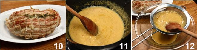 Deixe cozinhar por pouco mais de uma hora (para verificar se o assado está cozido, espete-o com um palito: se sair um líquido branco, estará no ponto, se o líquido for rosado, a carne precisa de mais tempo de cozimento), em seguida, retire o assado da panela e mantenha-o aquecido 10, talvez cobrindo com uma tigela. Em seguida, engrosse o fundo de cozimento 11 e coe com uma peneira 12. Neste ponto, corte o assado em fatias e regue cada fatia com o molho de cozimento.