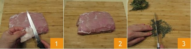 Para preparar o assado de porco à pururuca, comece eliminando os tendões presentes com uma lâmina bem afiada 1. Deixe-a deslizar entre a carne e a parte branca translúcida, tomando cuidado para não cortar também a polpa 2. Esta operação serve para eliminar a parte mais dura do pedaço de carne. Separe o pedaço de lombo e, enquanto isso, pique finamente o alecrim 3.