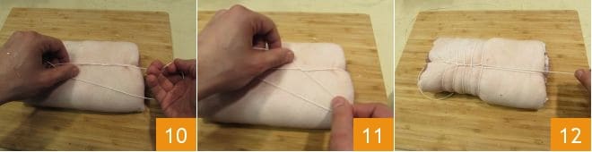 Neste ponto, você deve Como amarrar o assado. Em seguida, enrole o barbante no sentido do comprimento, amarrando as pontas 10. Deixe uma parte do barbante mais longa. Faça um primeiro nó em uma parte alta de uma das extremidades para fixar a base 11. Continue repetindo, dessa forma os vários nós em forma de laço manterão firmemente a pele com a carne 12.