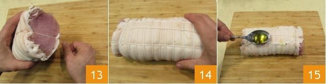 Finalmente, dê uma segunda volta em torno do lombo com o barbante, passando-o ao longo da parte superior 13 e aperte com um nó 14. Espalhe um pouco de azeite de oliva extra virgem 15