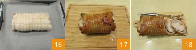 e coloque o assado em uma assadeira forrada com papel manteiga 16, asse em forno pré-aquecido a 190° em modo estático por 1 hora e meia (recomenda-se evitar o forno ventilado, pois a carne secaria demais). Para garantir o cozimento, use um termômetro para assados e faça com que a ponta atinja o coração do lombo, cuja temperatura ideal deve ser de 69°. Seu assado de porco à pururuca está pronto 17 para ser desamarrado à medida que for fatiado 18! Bom apetite!