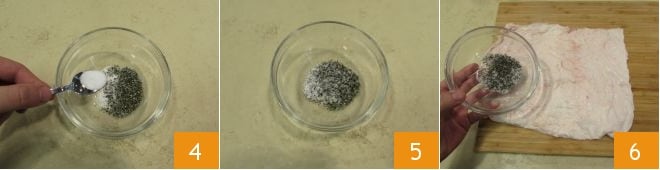 Em uma pequena tigela, adicione uma pitada de sal 4 e misture com uma colher de chá para integrar tudo 5. Coloque a pele sobre uma tábua e espalhe sobre toda a superfície sal e alecrim 6.