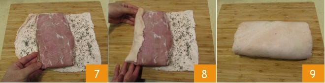 Coloque no meio o lombo de porco 7 e envolva-o cuidadosamente com a pele 8 de modo que a polpa esteja inteiramente coberta 9.