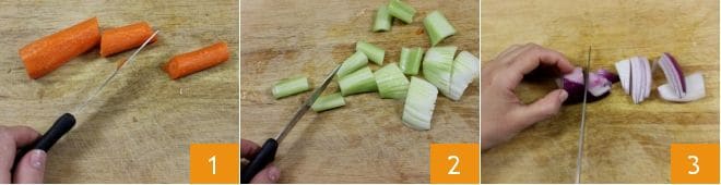 Para preparar o assado recheado com figos e presunto cru, comece pelos vegetais que servirão para cozinhar o assado. Limpe e corte as cenouras ao meio 1. Lave as costas de aipo e corte em pedaços grandes 2. Em seguida, limpe a cebola roxa e corte também em pedaços grandes 3. Deixe os vegetais de lado.