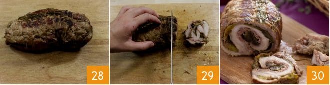 Então, quando estiver frio 28, pegue o assado e coloque-o em uma tábua de cortar, fatie em fatias de cerca de 2-3 cm de espessura 29. Seu assado recheado de figos e presunto cru estará pronto para ser servido quente ou morno 30 acompanhado pelo molho de vegetais!