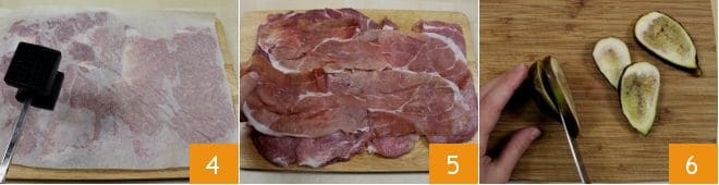 Depois pegue a carne, coloque-a em uma tábua de cortar, cubra com uma folha de papel manteiga 4 e bata com o martelo de carne para torná-la fina e macia. Em seguida, remova a folha de papel manteiga e coloque as fatias de presunto cru sobre a carne 5. Lave os figos e, com a casca, corte-os em fatias de cerca de meio cm de espessura 6.