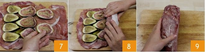 Coloque também as fatias de figo 7 criando uma camada sobre o presunto, deixando cerca de 1 cm da borda e depois comece a enrolar bem o assado 8, delicadamente para não deixar o recheio escapar, até fechá-lo completamente 9.
