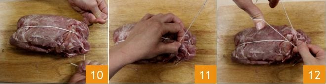 Agora amarre o assado com o barbante de cozinha. Para esta operação, você pode consultar a escola de culinária: Como amarrar o assado. Passe o barbante primeiro por baixo e depois por cima da carne 10, no sentido do comprimento, fixando bem as pontas do fio nas extremidades 11 e deixando uma parte do barbante um pouco mais longa. Para formar a rede, pegue o barbante e crie um laço, segurando a base com os dedos, insira a mão no laço 12.