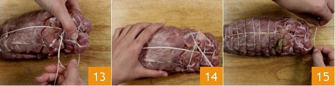 Gire a corda algumas vezes, depois passe a carne pelo laço obtido 13. Fixe bem a base do laço apertando o anel criado em torno da carne e puxando levemente o barbante para cima para apertar o nó 14. Complete a rede repetindo esta operação até terminar a amarração em todo o comprimento da carne. Finalmente, fixe tudo com um nó na extremidade da carne 15.