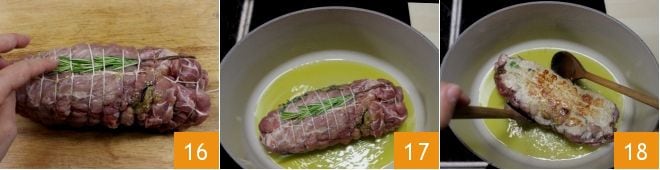Insira na rede um ramo de manjerona, um de tomilho e um de alecrim 16. Em seguida, pegue uma panela grande, despeje bastante azeite de oliva até cobrir o fundo, adicione o assado 17, vire-o para dourar do outro lado também 18 (para virar, use 2 colheres de madeira).