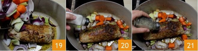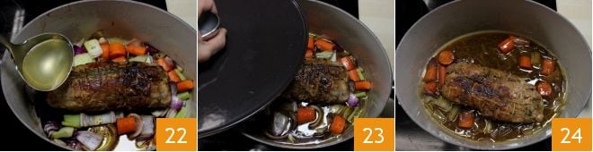Despeje o caldo de legumes 22 (encontre aqui a ficha do Caldo de legumes) e cozinhe com a tampa 23 em fogo baixo por uma hora e meia, virando o assado de vez em quando. Depois do tempo necessário, destampe e desligue o fogo 24.