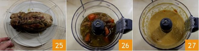 Retire o assado em uma grade e deixe esfriar 25; despeje o fundo de cozimento no liquidificador para bater 26 e obter um molho espesso 27 que você usará como acompanhamento.