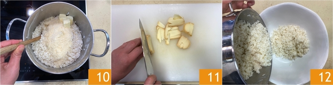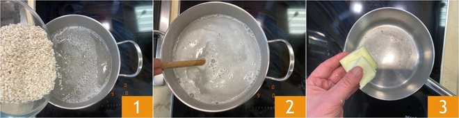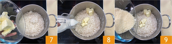 Escorra o arroz al dente e misture com os 180 g de manteiga restantes 7, o leite 8 e 80 g de Parmigiano Reggiano ralado 9.