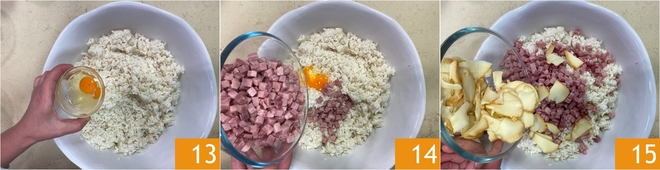 Adicione o ovo 13, o presunto em cubos 14 e quase todo o queijo scamorza 15, cuidando para deixar alguns pedaços para a superfície.