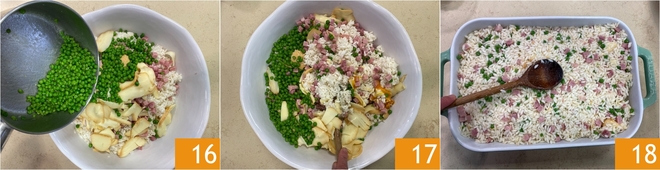 Adicione também as ervilhas 16 e misture tudo 17. Transfira a mistura para uma assadeira de 34x23 cm e nivele a superfície 18.