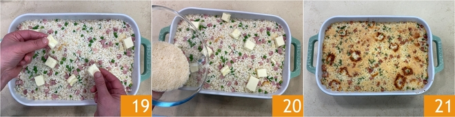 Coloque por cima os pedaços de queijo scamorza reservados 19 e os 20 g de Parmigiano restantes 20. Asse no forno estático, pré-aquecido a 220°C, em modo grill por 15-20 minutos. Tire do forno 21 e sirva seu arroz de forno em branco!