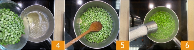 Adicione as ervilhas 4, misture e cozinhe por cerca de 5 minutos 5. Por fim, ajuste o sal 6 e reserve.