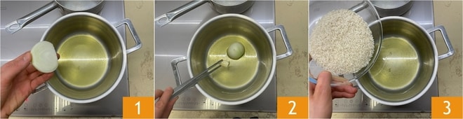 Para preparar o arroz basmati com salmão, gergelim e molho picante, aqueça primeiro a água que você usará para cozinhar o arroz. Aqueça o azeite em uma panela grande, adicione meia cebola 1 e um dente de alho esmagado 2 e deixe apurar o sabor. Retire o alho e a cebola e adicione o arroz basmati 3.