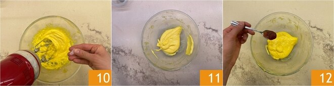 Terminando o óleo, adicione o sal 10 e continue a emulsionar. Quando a maionese estiver pronta 11, adicione o molho sriracha e misture com uma espátula 12.