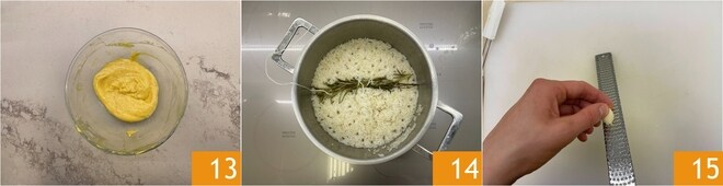 Reserve a maionese 13. Enquanto isso, o arroz terá terminado o cozimento 14, retire o maço de ervas e reserve. Cuide dos vegetais: rale o alho 15.