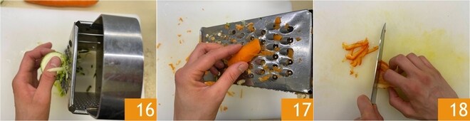 Faça o mesmo com as abobrinhas 16 e as cenouras usando um ralador de dentes largos 17. Limpe os pimentões e corte-os em tiras 18.