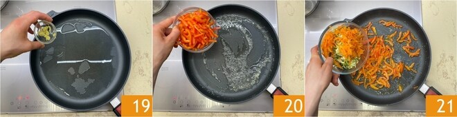 Em uma frigideira antiaderente, adicione óleo vegetal e o alho picado 19, deixe apurar por alguns minutos, em seguida adicione os pimentões 20 e os outros vegetais ralados 21.
