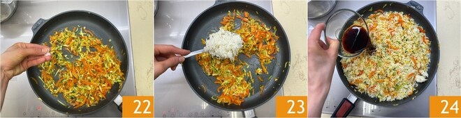 Salteie tudo junto por 5 minutos e adicione sal 22. Adicione o arroz 23 e salteie junto com os vegetais. No final do cozimento, desligue o fogo e adicione o molho de soja 24, misturando tudo junto.